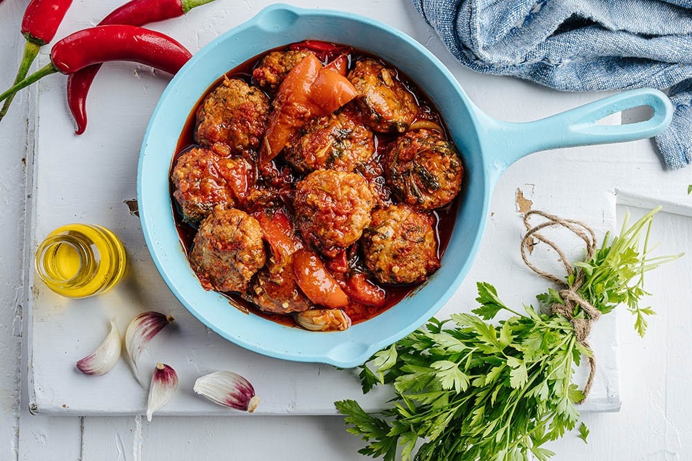 קציצות דגים מבושלות ברוטב עם שום ופלפלים, פיקנטי עד חריף, מכיל פירורי לחם