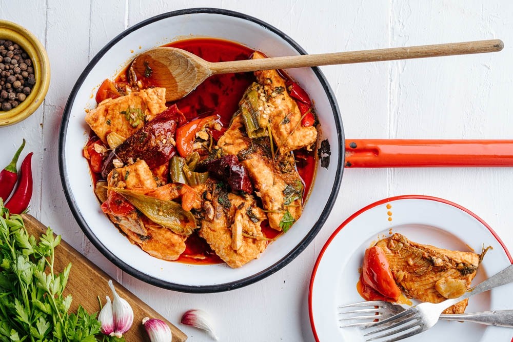 פרוסות טונה מבושלות ברוטב עם שום ופלפלים, פיקנטי עד חריף